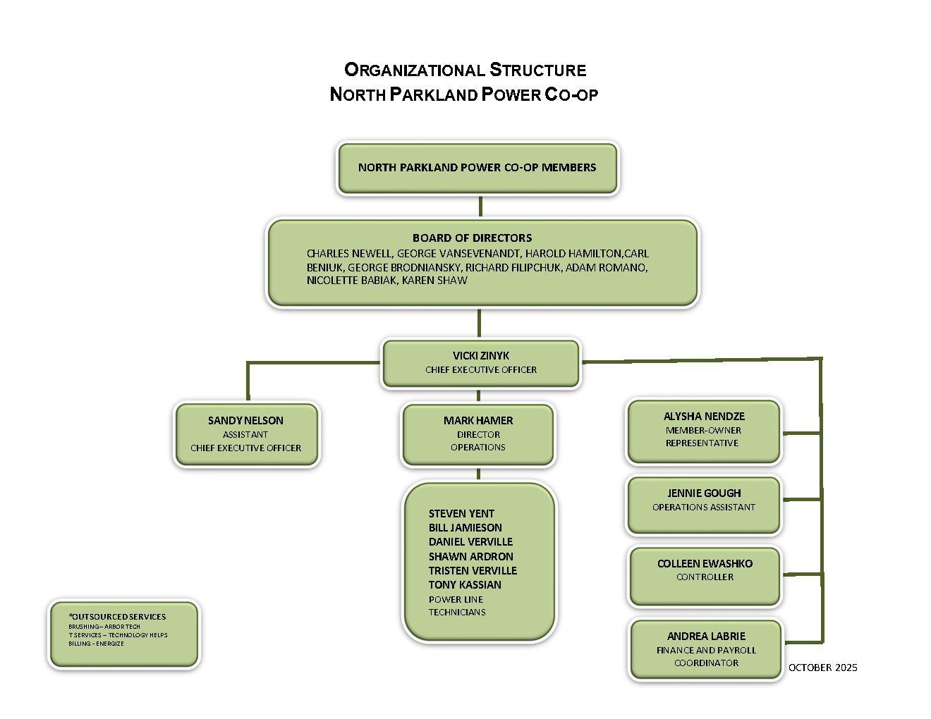 We pride ourselves in supporting local career programs and recruiting local talent. As a self operating, member owned organization, we own and maintain the power poles and lines in our operating area, which stretches as far south west as Morinville and as far north east as Lac La Biche. This equates to 1590 kilometers of line and approximately 15,900 power poles. Our team consists of 7 Journeyman Power-line Technicians, and a team of office staff, field support, and management that round out our diverse North Parkland Power Co-op team, providing valuable information and service to all our members.